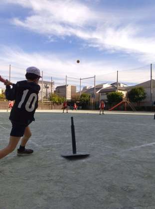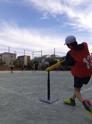 くり返し、練習・試合をしてきて、打撃も守備も上達しています。スイングが鋭いです。そして守備に使っているビニールを張ったフラフープもだいぶ傷んで補修されていました。使い込んできた証ですね。