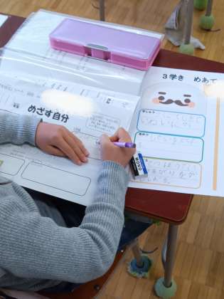 3学期の目標を決めてカードに書いたり、キャリアパスポートの「めざす自分」を追記したりしていました。