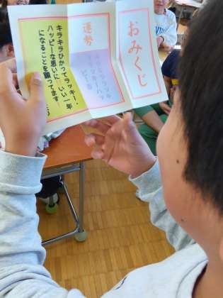 ある学級で「おみくじ」をしていました。みんなが作ったいろいろな「吉」を引くようです。吉(以上)しか出ないので、安心して引けます。「おみくじ」の文字が本格的。私の分の運気も乗せて引いてもらった結果は、