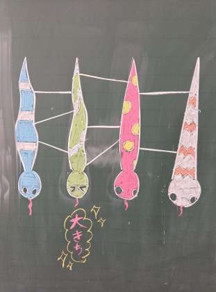 他のある学級の担任による黒板の新年のメッセージ黒板アートの一部はヘビを模したおみくじになっていました。かわいいですね。運だめしにぜひどうぞ!私は「キラキララッキーラッキーハッピー吉」ですから、大吉くらいすぐ出せちゃうかと思ったんですが、3回目でようやく大吉にたどり着きました・・・たぶん明日くらいから効果が出始めるんだと思います。