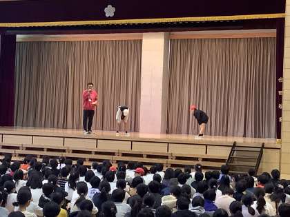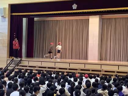 運動委員会の児童が舞台の上で、持久走で気をつけた方がいいポイントを演じてくれました。