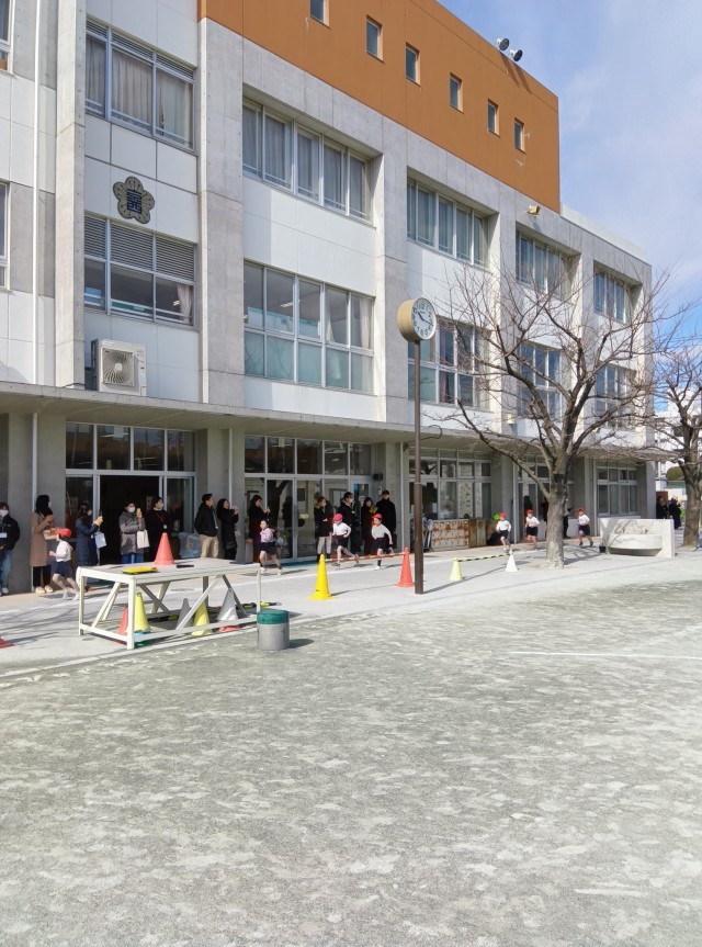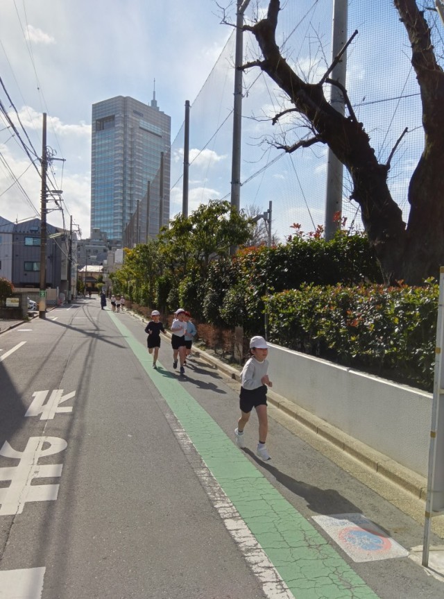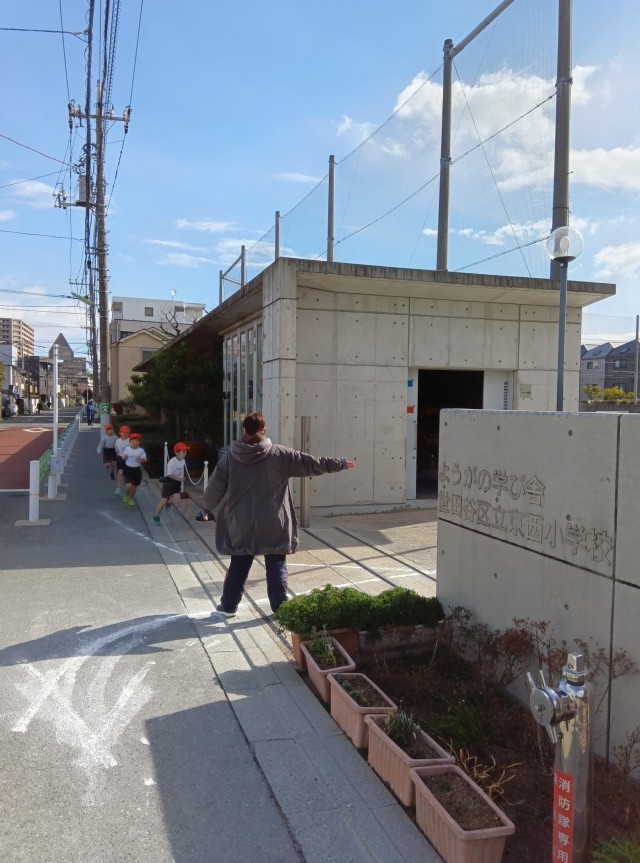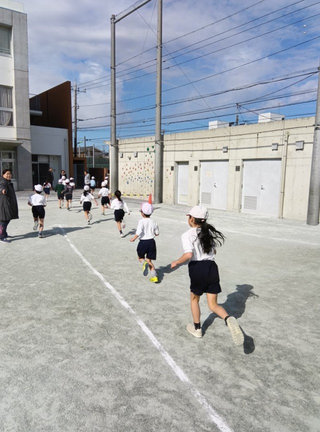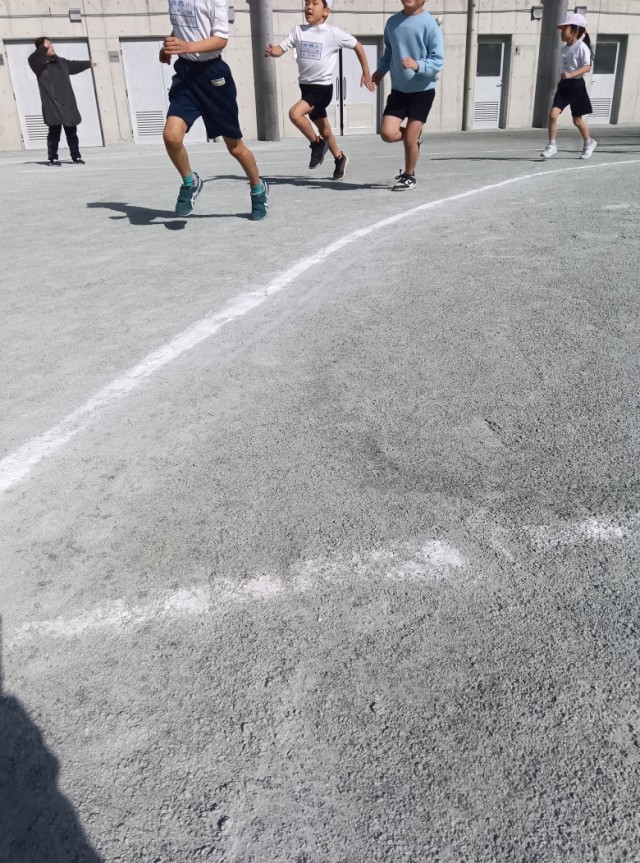 1年生は、校庭を2周した後、学校の周りを1周して校庭戻り、校庭をもう1周してゴールという720mのコースです。