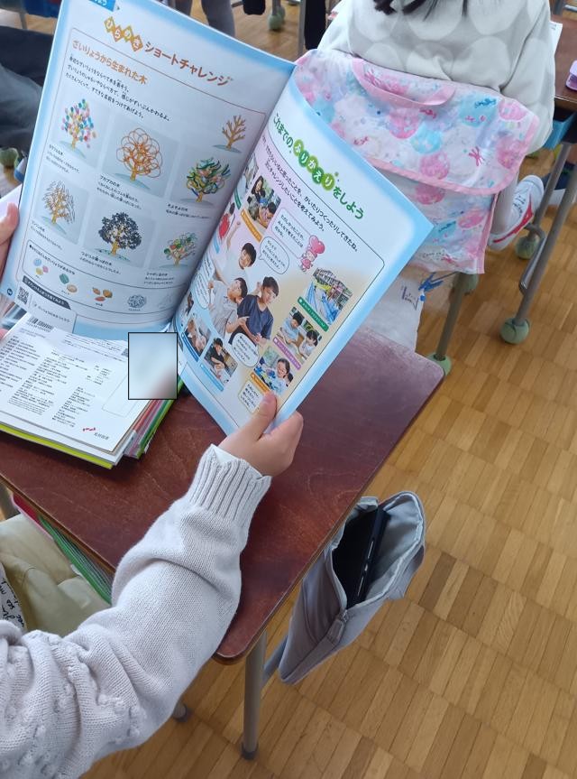 配られた教科書には早速名前を書いていました。名前が書けたら、早速ぱらぱらとめくって見ていました。新しく始まる教科には特に興味津々です。