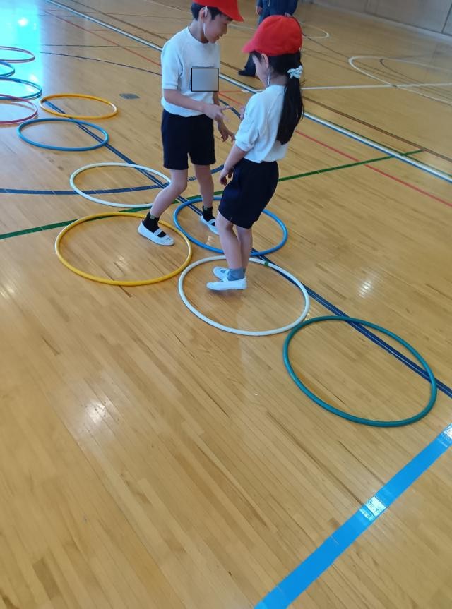 体育館体育では、ケンケンまたはケンケンパ走りでドンじゃんけんゲーム(名称は様々あると思いますが)をしていました。ケンケンやケンケンパで進んで出会ったところでじゃんけんをして、勝ったら進む、負けたら次の人がスタートして敵陣を目指します。時折じゃんけんが強い子がいて、突き進む場面があり盛り上がっていました。