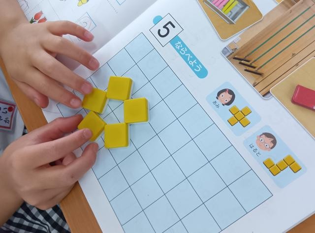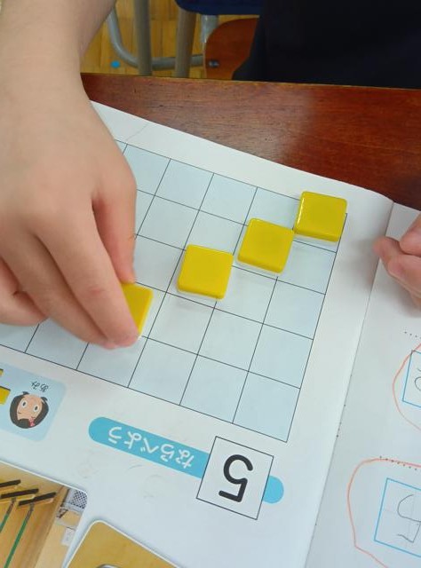 さて、教室では算数の学習をしていました。まずは「数字」の学習です。いくつあるか、を数えて数字を書きます。そして、5つの「ブロック」を用意して、マス目の中に、いろいろな並べ方で並べていました。マスを生かした並べ方もあれば、マスとは関係なく、でも規則性をもって並べている子もいておもしろいなと思いました。