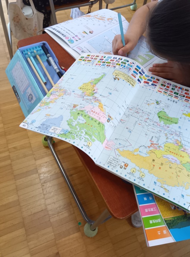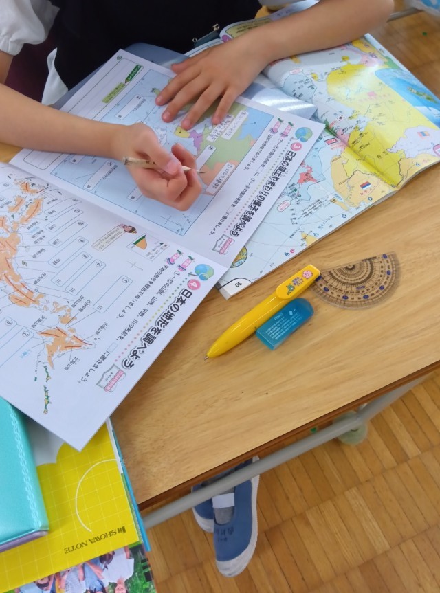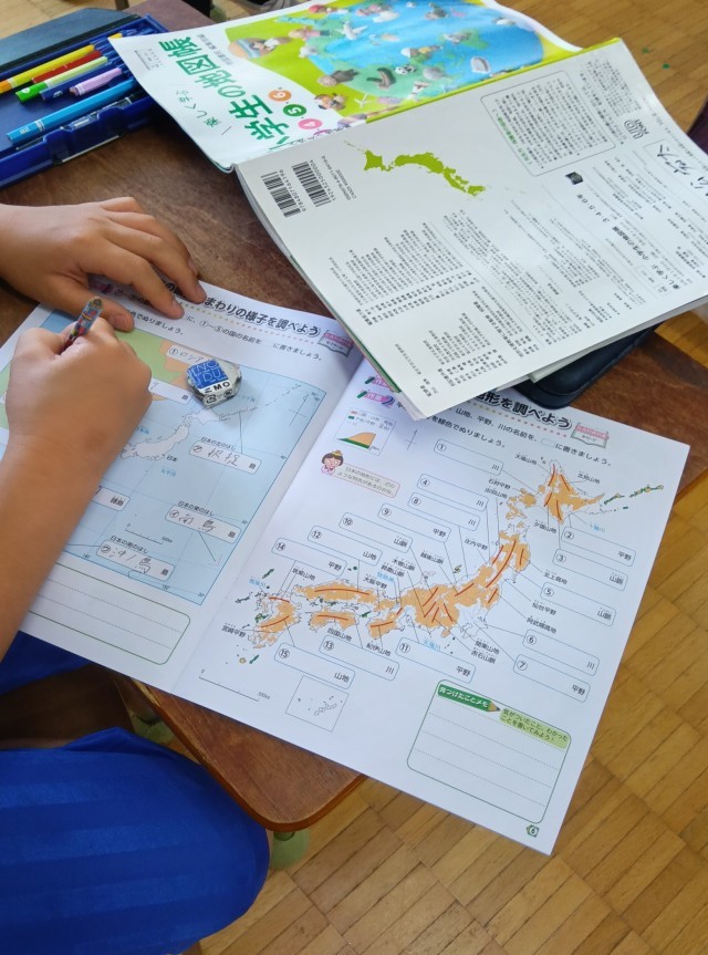 そして、5年生の社会は3年生の「世田谷区」から1つ広げた4年生の「東京都」からもう1つ広げて「日本」です。いわゆる「地理」の内容です。初めのところで日本の周りの様子を大きく捉えるために周辺の国や日本の領土(最東西南北端の島)、大きな川や山地などの名称について調べて書き込んでいました。4年生の記事で書いたとおり、4年生で都道府県を覚えて5年生になっています。あとは、距離感だったり、位置関係だったり、それを実感をもった知識にしていけるかが今後のポイントです。用賀→世田谷→東京・・・と徐々に広げてきて、少しずつその辺の感覚は掴んできていると思います。行ってみるのが一番ですが、全てを実際にやってみないと分からないのでは不便です。持っている経験と比較して考えるのも大切ですね。○○までは電車で○時間で、●●まで飛行機で●時間だから・・・これからどんどん広がっていく社会科の学習、楽しんでほしいと思います。