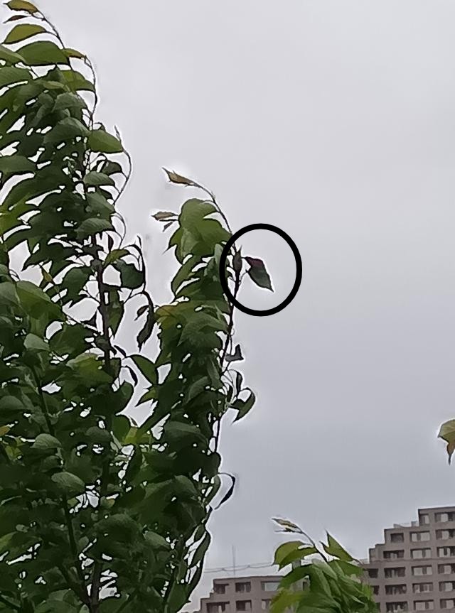さて、最後の2枚は月曜日のフタバです。たっぷりの緑の中でも存在感があります。風が強く枝全体があおられ、ほとんどの葉っぱが左側になびく中(若い葉はまだ柔らかくしなやかなんだと思います)、そのままの姿勢を保っていました。どっしりと構えるその姿に改めて驚きですが、こんなにまともに風を受けて大丈夫なのかなと心配にもなりました。「しなやか」大事です。