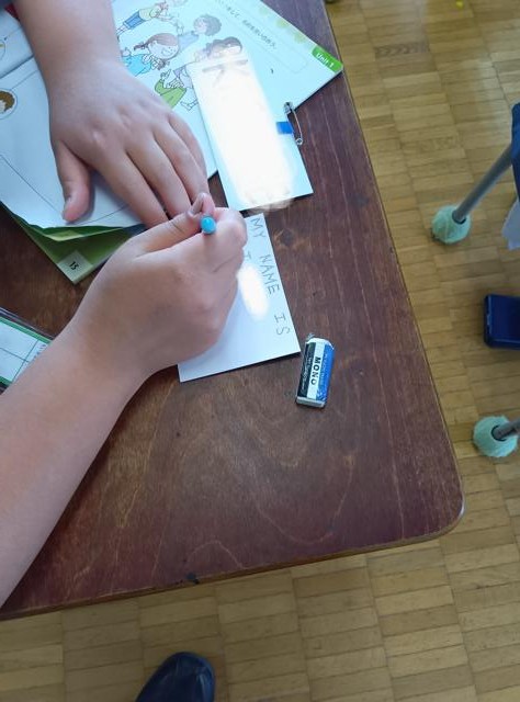 後半の4枚はゲームをしているところです。調子を表す表現をたくさん習い、その中の1つが呼ばれたら真ん中に置かれた消しゴムを取ります。よくあるゲームで、盛り上がります。途中フェイントに騙されつつ、唐突にコールされる正解の単語に一瞬遅れて2人が反応します。紙一重の差でも先に手の入った方が勝ちです。あまりに微妙だと取り合って争いに!オーマイガッ!そんな時は仲良く・・・