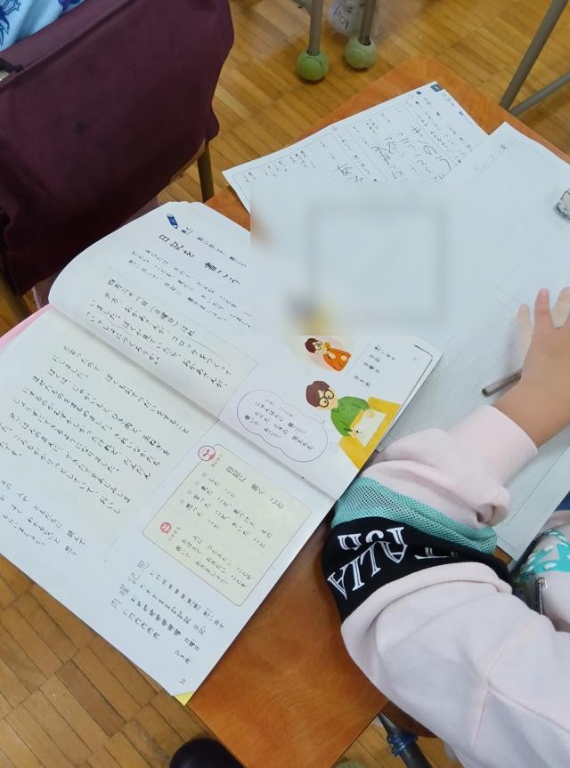 そして連休明け、書いてきた日記を互いに読み合い、良いところを見付ける活動をしていました。「読みタイム」と「つたえタイム」があり、読んで良いところや感想を伝えたり、質問をしたりしていました。全体でも共有し、こんな風に書こう、というモデルができてきました。