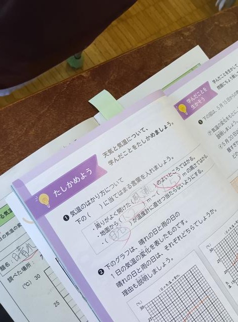 4年生の理科です。「天気と気温」について学習してきた4年生、まとめの問題と学んだことを生かす問題に取り組んでいました。