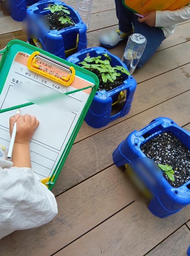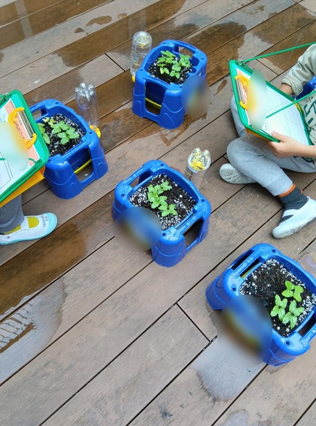 先日植えたと思ったら、早いですね。しかも6こ、7こと見事に発芽しています。双葉の様子をよく見たり、触って感触を確かめたりしながら観察していました。