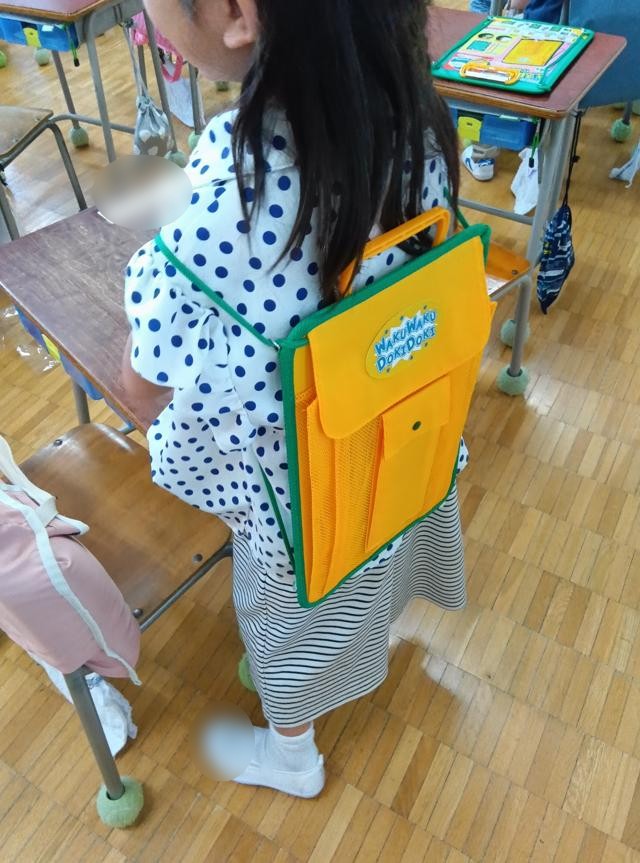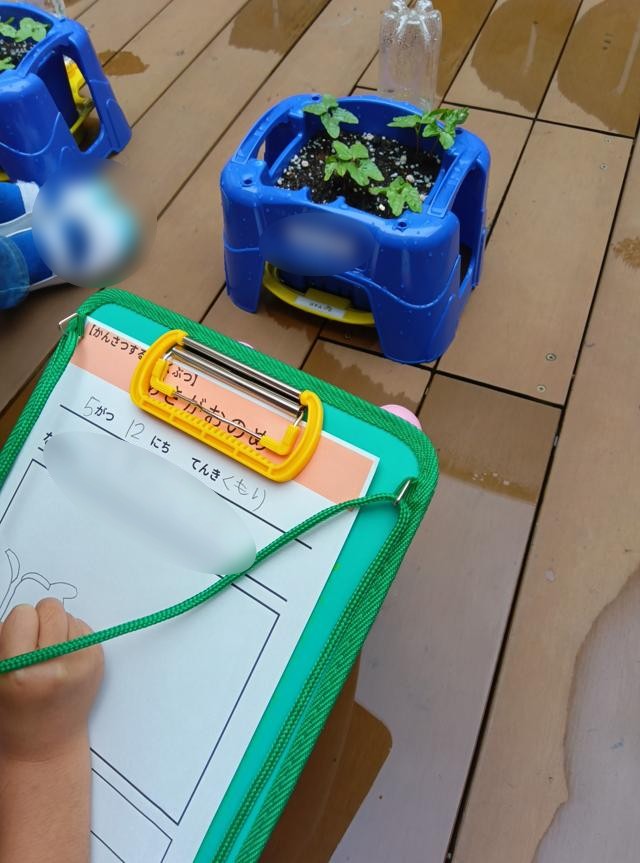 観察に使っているのは、「探検ボード」とか「観察ボード」と言われるもので、小学校のマストアイテムです。別の学級ではちょうどそれを配っているところでした。ひもがついているので首から下げて、お腹あたりを支点にして持ち、挟んだ紙に絵や言葉を書くことができます。観察や見学などでお話を聞く際などにも使います。ちょっとしたポケットが付いていて、筆記用具などを入れることができ便利です。これから6年間使います。長持ちランドセル級です。いろいろな時に使うので、大切に使っていってほしいと思います(結構つくりはしっかりしていると思います)。