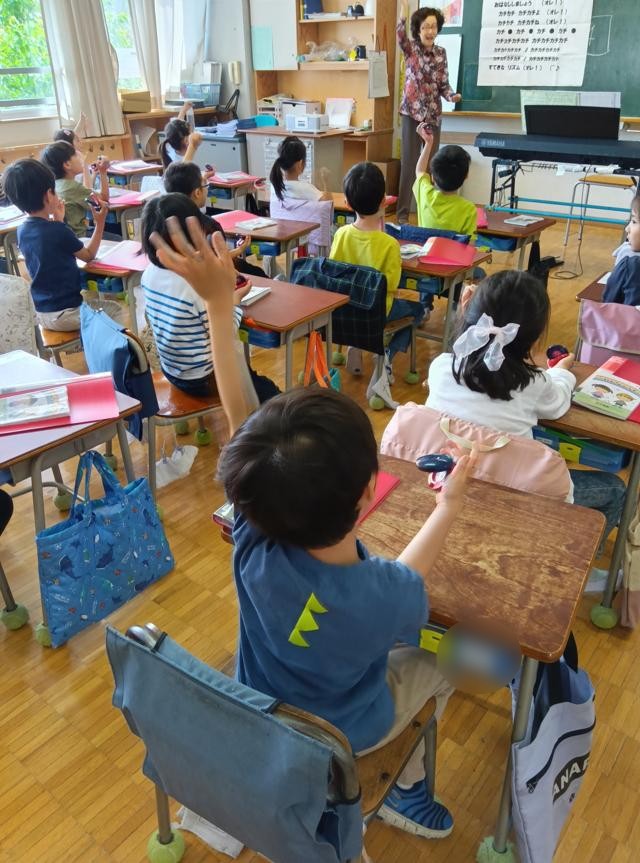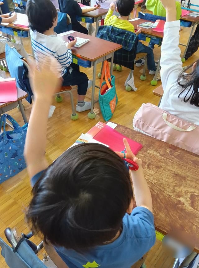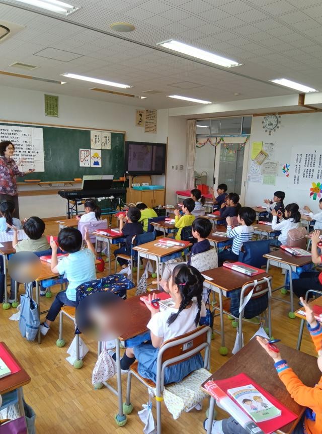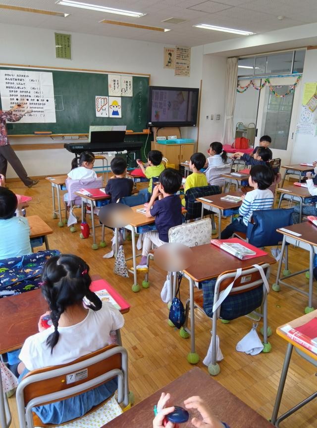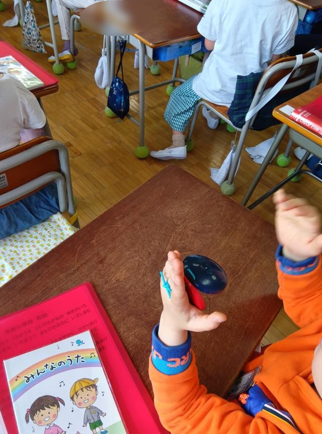 1年生の音楽、カスタネットでリズム打ちをしています。「かわいいカスタネット」という曲です。歌いながらカスタネットを叩きます。