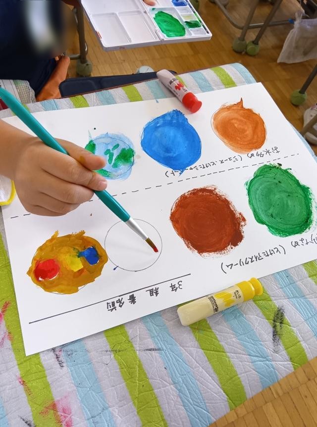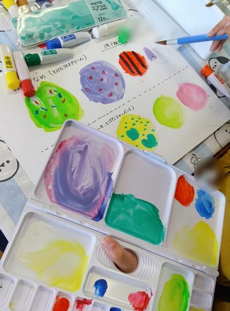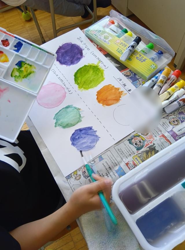 少なめの水で濃く描く列と、水を多めにして淡い色で表現する列がありました。作品づくりを通して絵の具と水の関係を学びます。基本的には水彩絵の具なので、水を混ぜながら塗っていきます。どれくらい混ぜるとどう変わるのか。色は。表面の様子は。塗るときの感じは・・・今後の作品づくりに生きていきます。