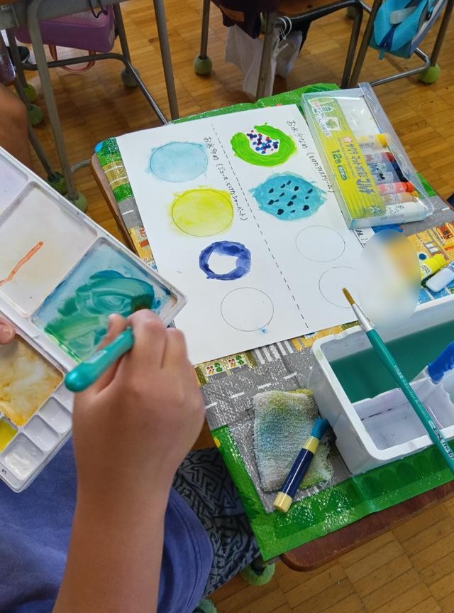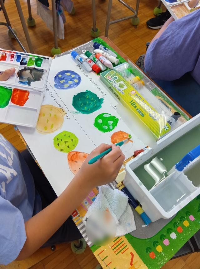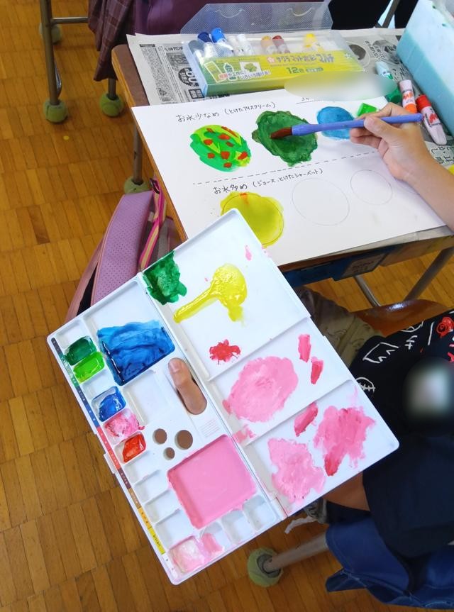 3年生の図工「いろんな味のアイスクリームをつくろう」で、絵の具の使い方を学んでいました。
