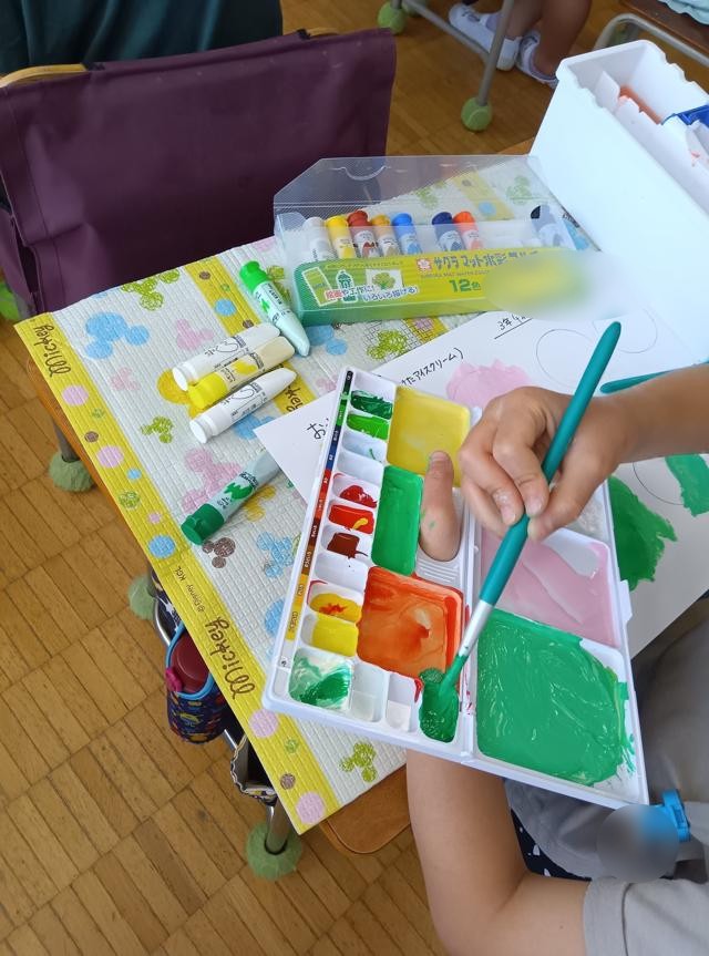今回、色を塗るところを見ましたが、もしかしたらこれはこの後、乾いたら切り取って、黒板にある先生のお手本のようにたくさんアイスの乗ったパフェみたいな作品になっていくのかもしれませんね。楽しみにしておきましょう。
