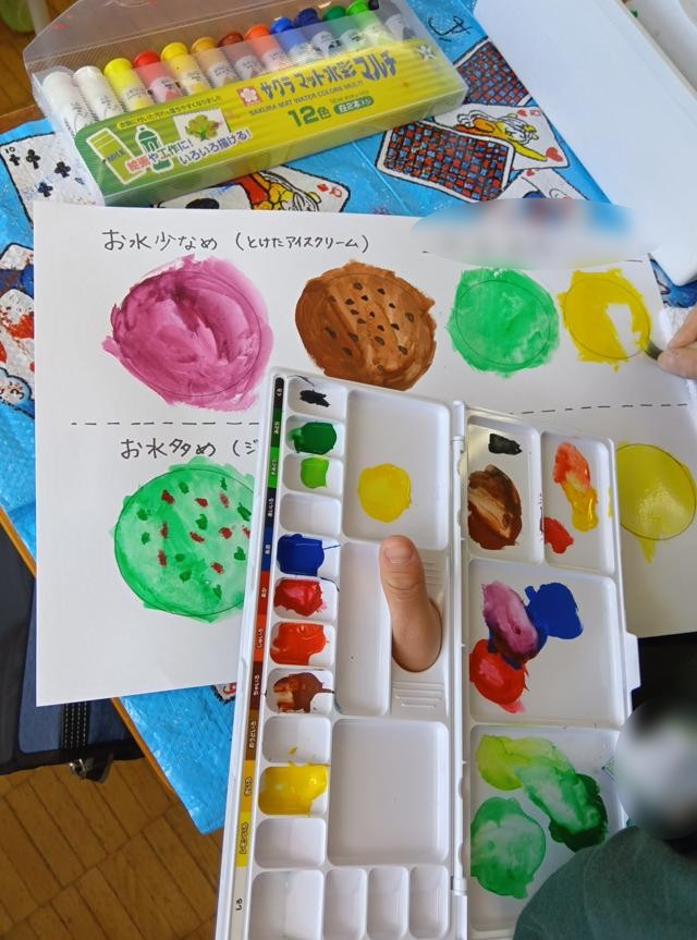 様々な絵の具の具合で塗っていきます。「色」が「味」を表現しています。茶色のチョコレート味、緑色のメロン味、あ、こっちはミント味!そこにチョコをまぶしてチョコミント味!「味」を決めるのはもちろん「色」ですが、それも水の混ぜ具合で微妙に表現を変えることができます。チョコミントなら少し水は少な目で濃く表現されていました。チョコミント好きからしてもおいしそうに見えるアイスになっていました。