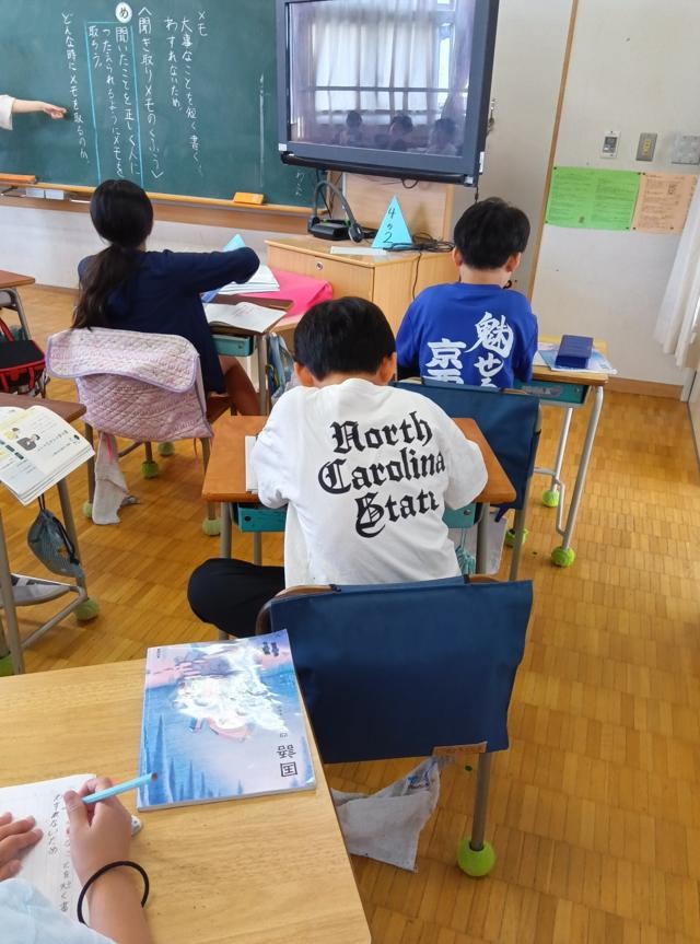 今後、インタビューなどを行い、そのときにメモを取りながら聞き、他から聞いてきた友達と知らせ合う学習のようです。この日は、練習でインタビューの動画で聞き取った内容をメモして、メモをするときに大切なポイントを確認していました。友達とも確認します。