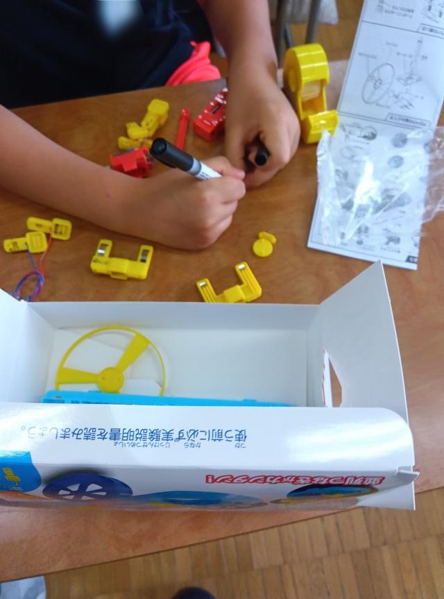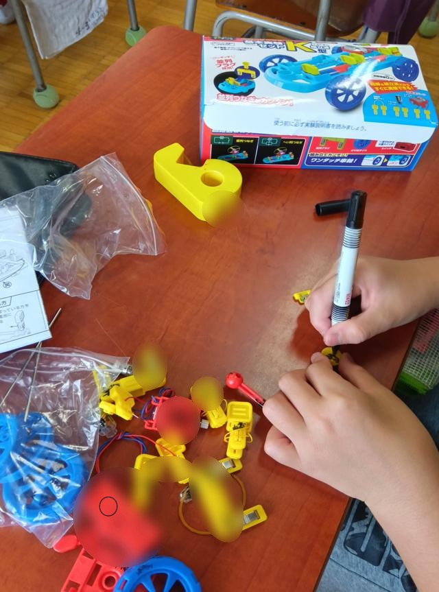 車になるのは最後の最後です。それまでの間に、このキットのパーツを使って、電流のはたらきに関する様々な実験を行っていきます。あ、そうそう箱にもお名前お忘れなく!