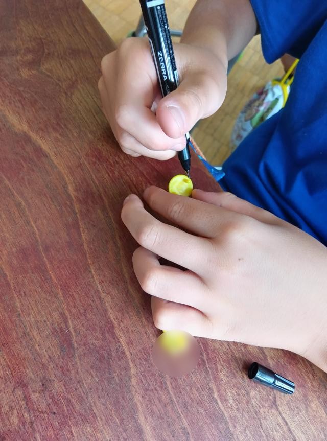 まずは配られたキットの中身を取り出し、パーツを確認します。確認が済んだら、この日はパーツに名前を書いていく時間です。車体やタイヤなどの大きな部品はもちろん、あらゆる小さな部品にも一つ一つ名前を書いていきます。これで安心、落としたとしても自分のところに戻ってきます。と、その時!
