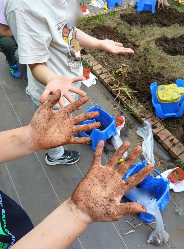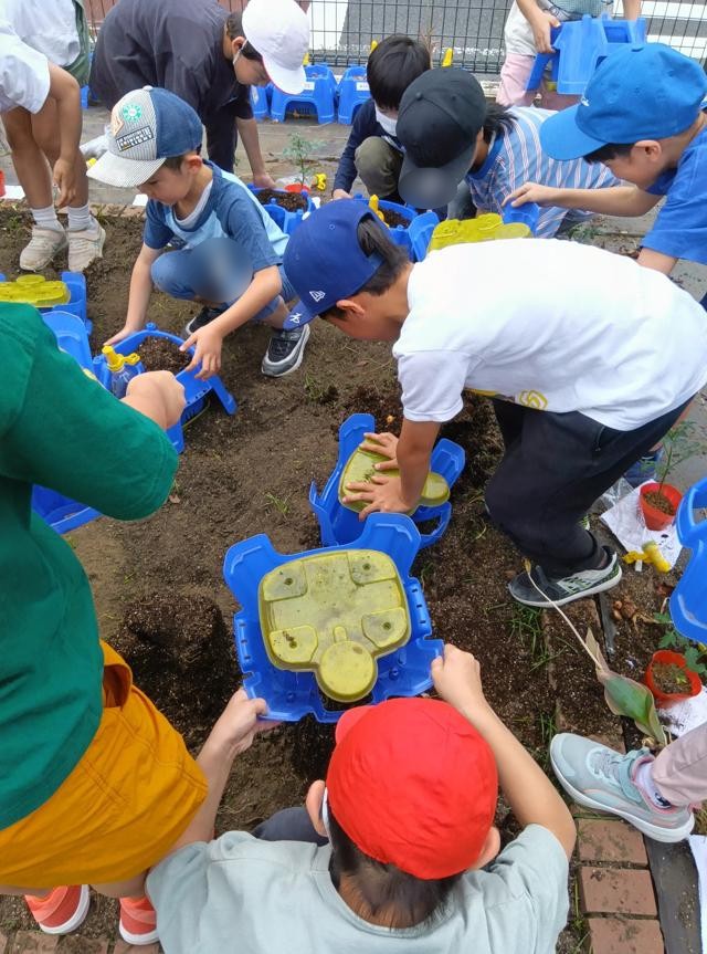 さて、これで空になった植木鉢に、先生から新しい土を半分ほど入れてもらいその上に苗を置きました。そして先ほど花壇にあけた土で上の方を覆いました。最後に第2校庭のネットに沿って並べたら今日の作業は終了です。ここまでくると手は土だらけ!手をよく洗って戻りました。