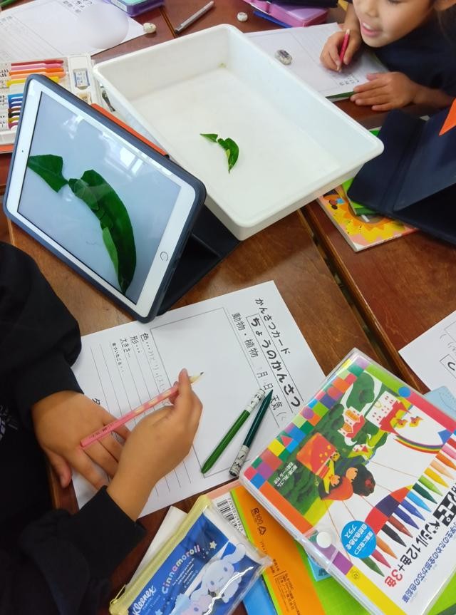 一方、隣の教室では、アゲハチョウの幼虫の観察中でした。目の前で幼虫がフンをしたそうで、大盛り上がりしている班がありました。楽しそう。