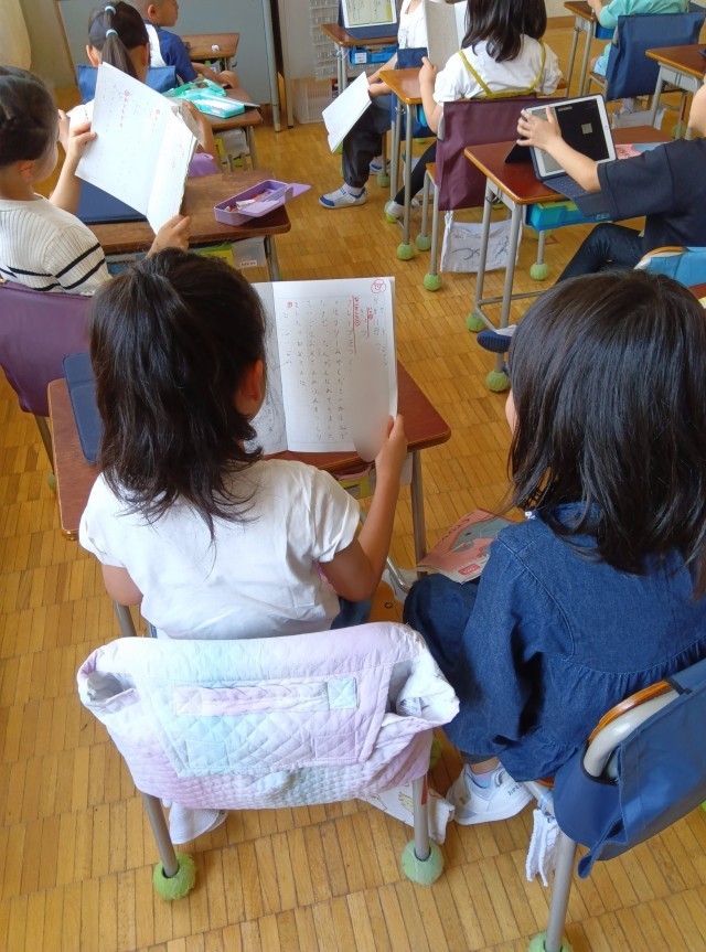 さて、練習と言えば、2年生は日記の取組を続けていくということで、学校の学習の中で書き方やポイントを確認しつつ、宿題で書いてきた週末の日記を読み合い学び合っています。友達の日記は参考になりますね。書く力をどんどん伸ばしていきましょう。
