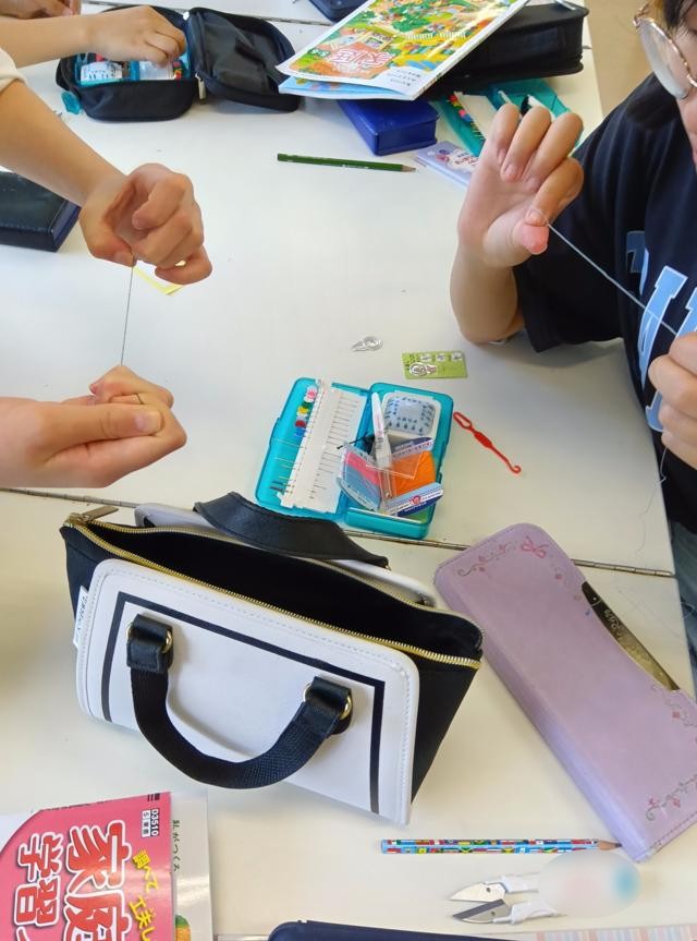 新しく裁縫道具を買った人は、道具も届いていました。ピカピカ新品の道具がまぶしいです。思えば昔は裁縫箱といえば、「小さなお道具箱」あるいは「大きなお弁当箱」みたいな大きなものでした。表面には、毬の絵?まあいろいろなものがあったと思いますが・・・とにかく大きかった。最近のものはというと、まず小さい!すごくコンパクトになりました。年々進化を遂げる裁縫道具ですが、更に小さくなったと思います。これは過去最小・・・!?