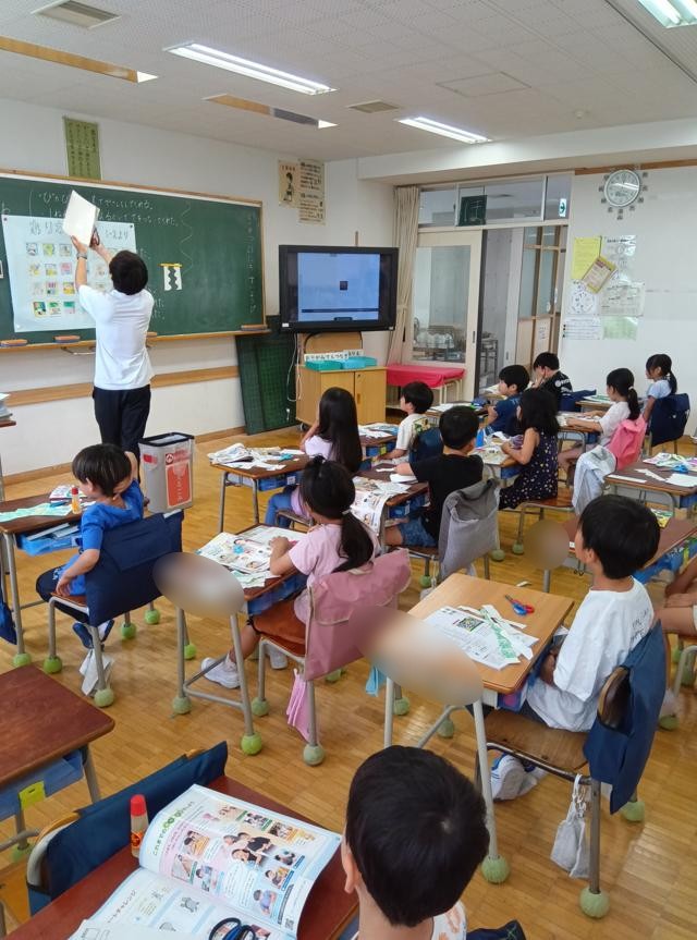 まずはいらない裏紙(表が印刷されていて裏を使うように取ってある紙です。学校では紙の節約、再利用にとってあり、よく使います。)で授業で使っても大丈夫そうなものを使っていろいろな切り方の練習をしていました。派手な紙が混ざっているなと見てみると、あいさつし隊のポイントカードの切る前のものでした。「おおっ」お札が大きな1枚の紙に印刷された切られる前のものを資料などで見ることがありますが、あれを見たときの感動に近いものがありました。まあもう終わっていますが・・・1年生は特に反応していませんでした。
