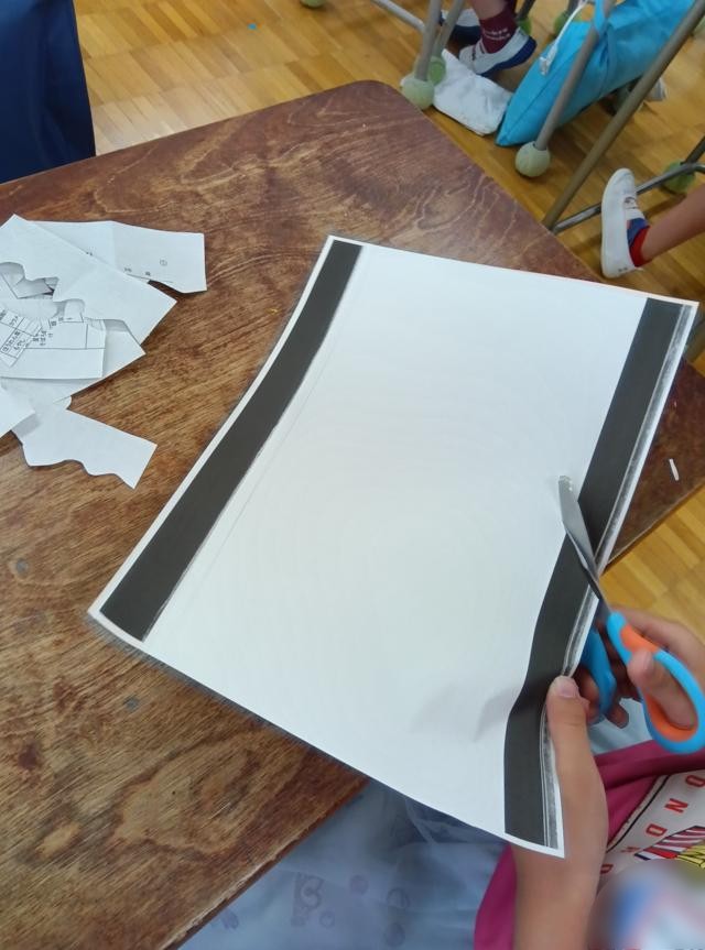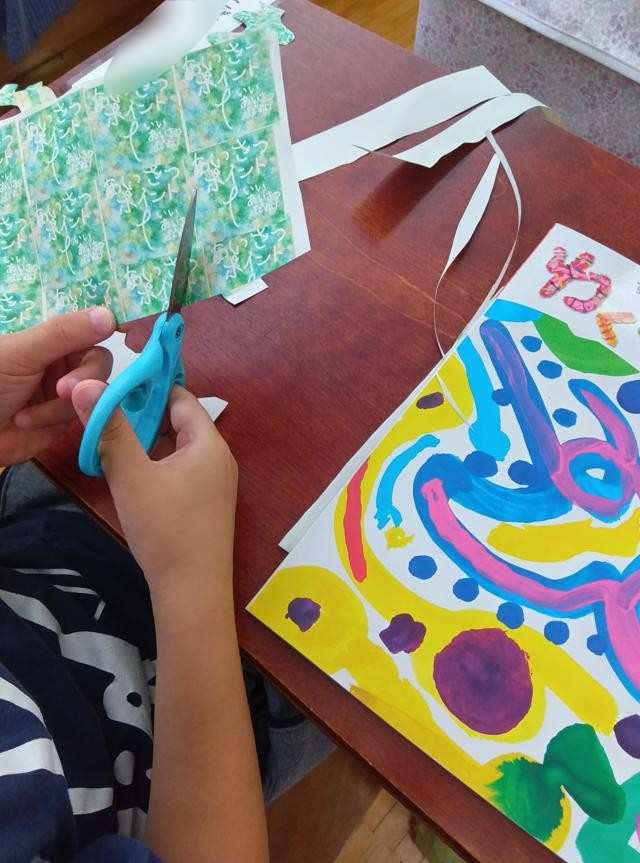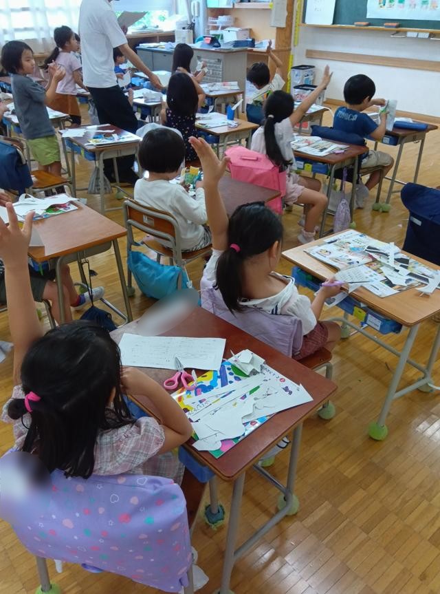 1年生の図工「チョッキン パッでかざろ」です。はさみをつかってチョッキン、チョッキン紙を切っています。