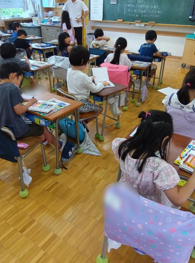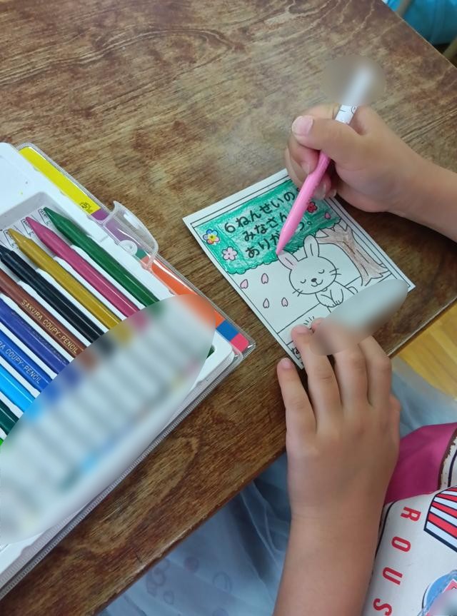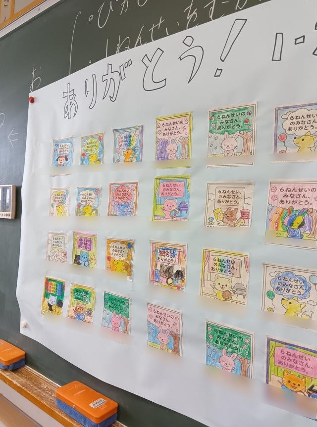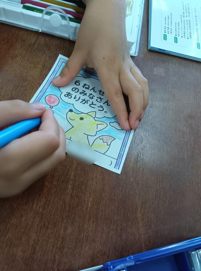 この日は、残りの時間で6年生へのお礼のカードをかいていました。入学からここまでお世話になった6年生に感謝の気持ちを伝えるようです。きれいに色塗りまでして、みんなのかいたカードを1枚の大きな模造紙にまとめていました。いつ渡しに行くんでしょう。見に行きたいですね・・・1年生というよりは、受け取る6年生の顔を見に・・・。
