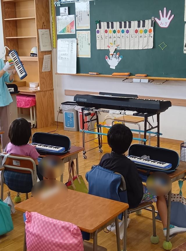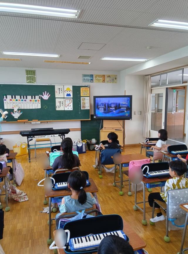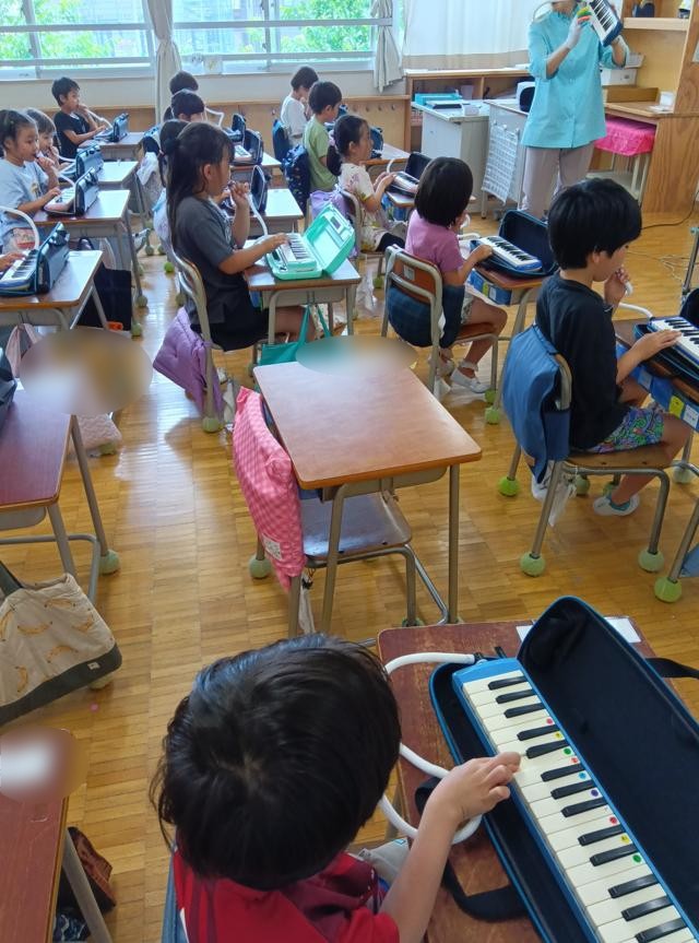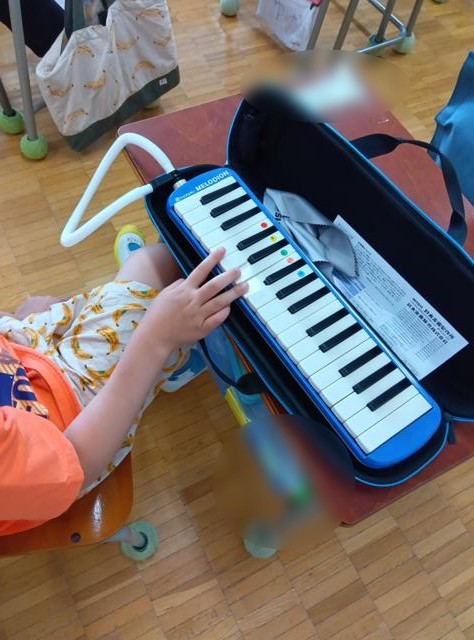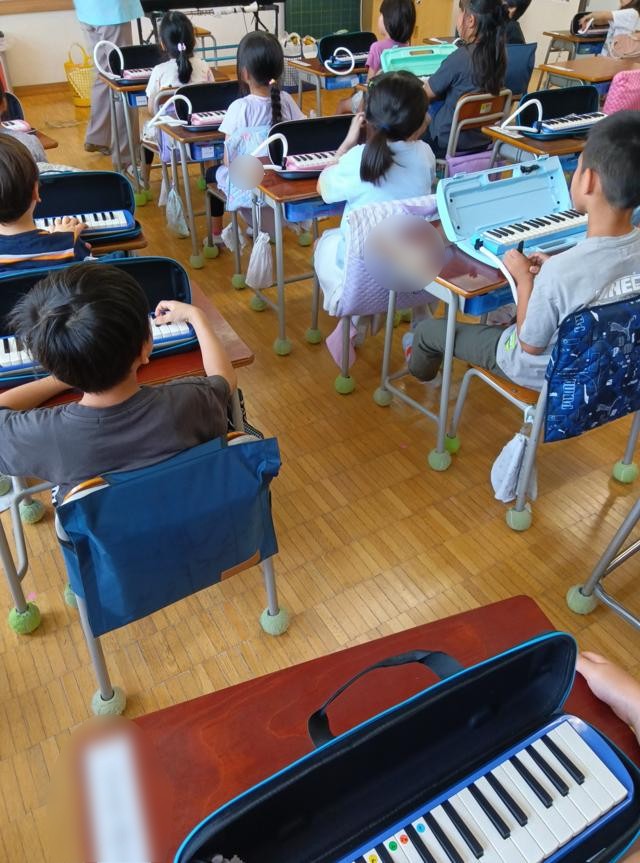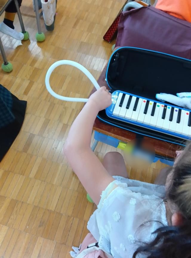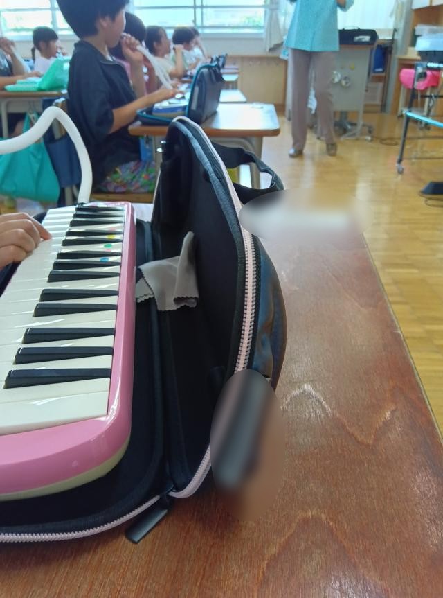 1年生の音楽、鍵盤ハーモニカの練習をしています。吹き口を根本のところに固定して「○○中」・・・そう、みなさん御存知の(!?)