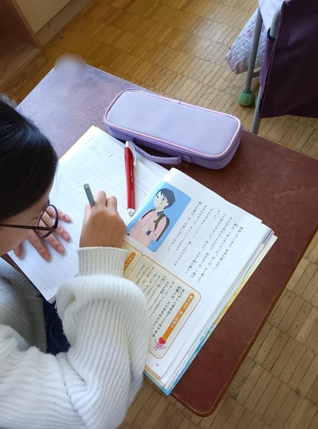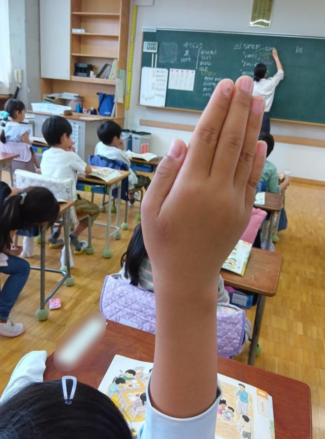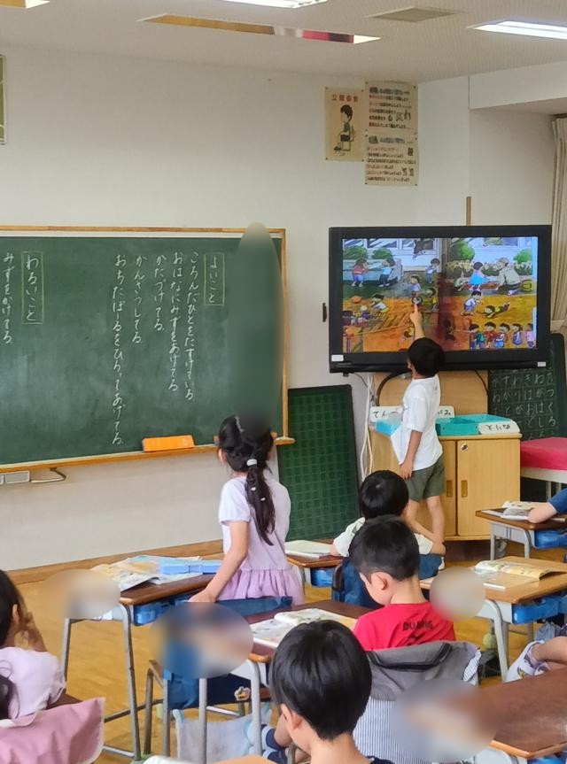 1年生はまだあまりワークシートやノートに書いたりはせず、どんどん発言をして授業が進んでいました。道徳では、自分の気持ちと向き合い、「書く」時間も多いです。参考に、5年生の道徳の時間の様子も載せました(写真7、8、9枚目)。かなり書く活動が入っていました。発表することだけではなく、「書く」ことも心の内を表す表現です。1年生は、まだ平仮名を習っている途中ですし、後半には書くことも増えてくると思います。