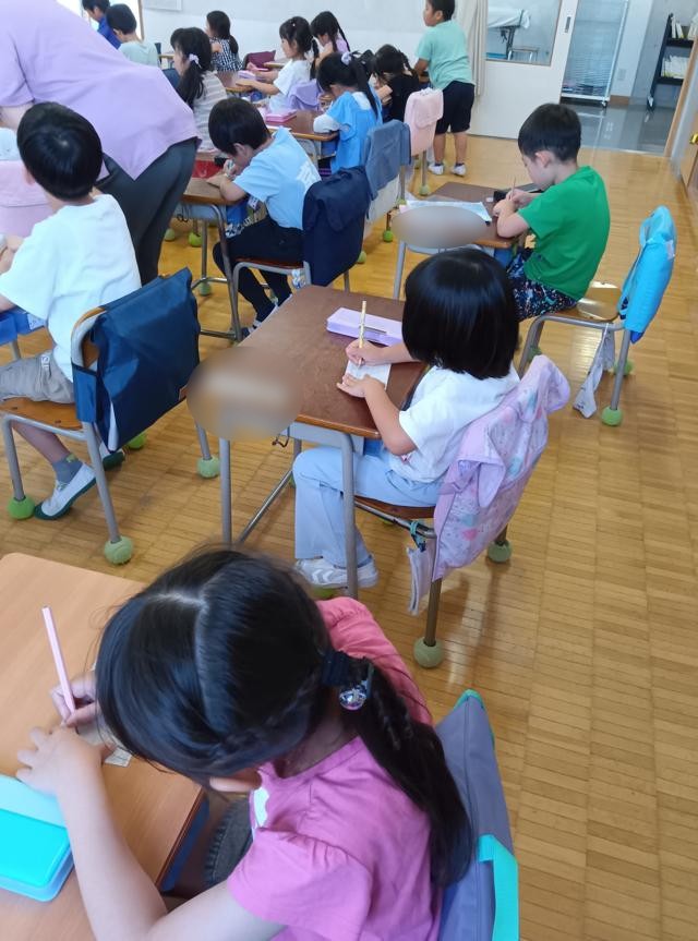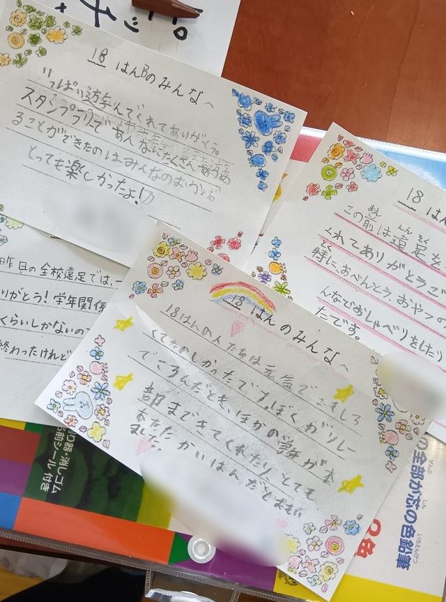 1年生がさくら組の班のみんなに、「全校遠足ありがとうカード」を書いていました。これは、全校で取り組む活動です。全校遠足で一緒に楽しく過ごした仲間に、感謝の気持ちを伝えるカードです。班全体に向けて書きます。