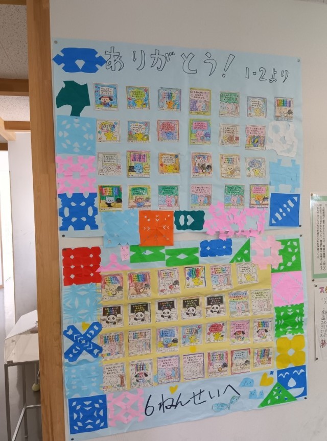 写真7枚目は、少し前に1年生が6年生に4月からのお礼をカードに書いていたものです。模造紙にまとめられ、図工の作品などで飾り付けて、6年生に贈られたようです。学級ごとに受け取ったんですね。これはうれしかったしょう。