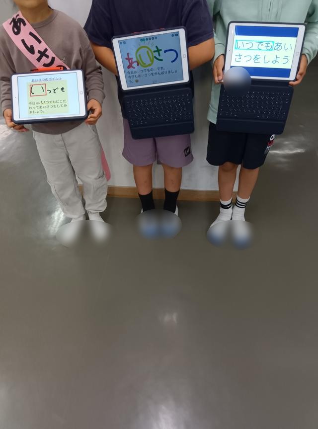 今週の「あいさつし隊」は4年1組です。先日、教室に行ったときに作戦会議をしていました。校内のいろいろなところに立って挨拶を展開しているようです。みんなタブレット端末を持っていて、挨拶のポイントが示されています。今日のポイントは、