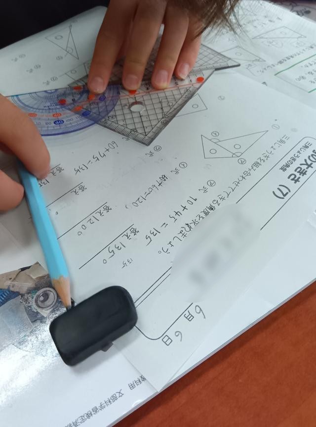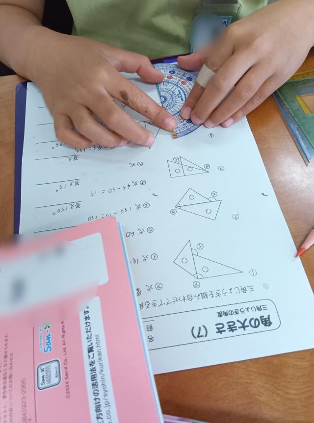 例えば、単純に角度を測るだけではなく、三角定規を重ねて、合わせた部分の角度や重ねたときに間にできる角度などを両手に三角定規を構え、さらに分度器を脇に置いておき、角を作って角度を測ります。三角定規二刀流180-180です。そこから、三角定規のそれぞれの角の角度も分かってきました。そうなってくると、後は図で表された問題を「計算で解く」なんてこともできるようになってくるわけです。測らずに角度を知る方法が身に付いてきているのです。
