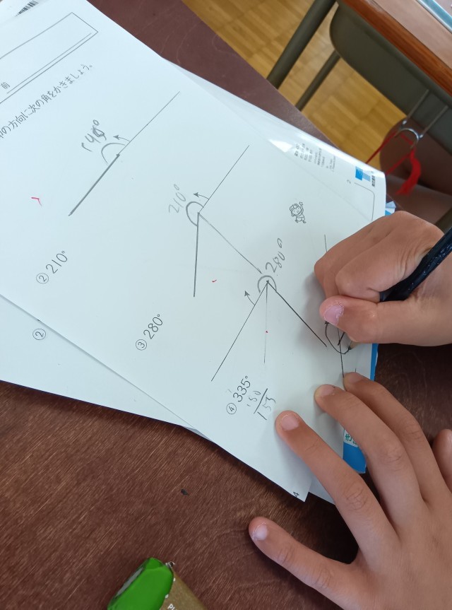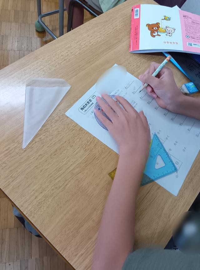分度器を使って「角度」の学習をしている4年生、基本的な角度の測り方などを学習し、少し複雑な応用問題にも挑んでいます。