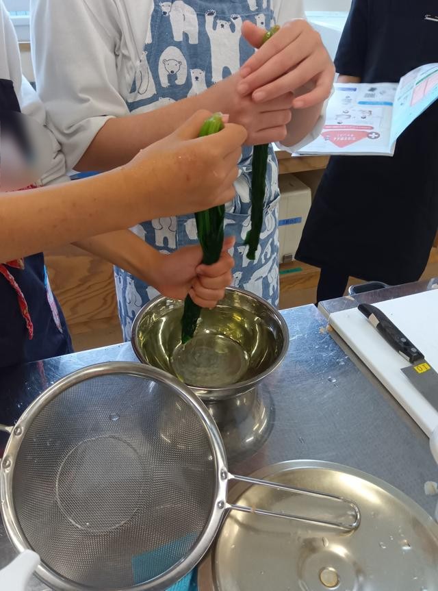 5年生が調理実習をしていました。今回は野菜を「ゆでる」料理ということで、「ホウレンソウのおひたし」とジャガイモを茹でた「ゆでいも」の2品でした。