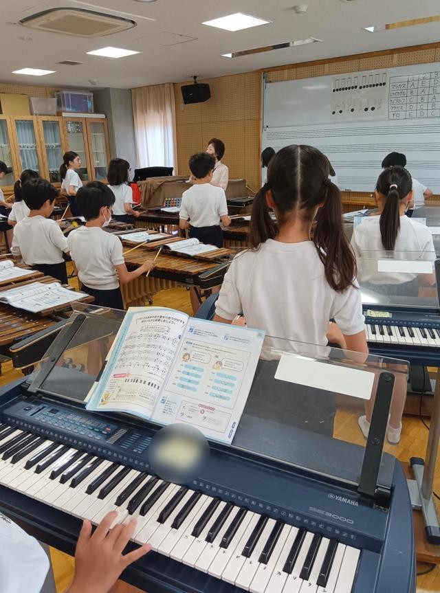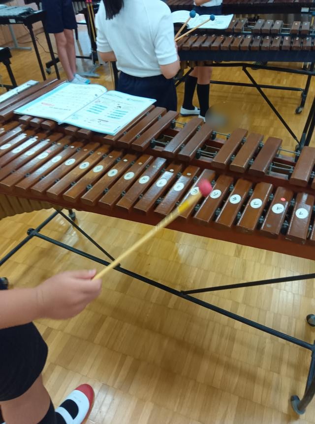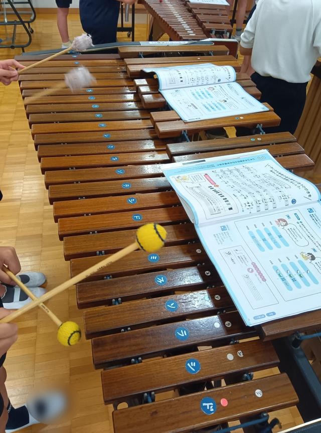 5年生の新しい曲の練習が始まっていました。曲名は「リボンのおどり(ラ バンバ)」です。この曲は、元々はメキシコ民謡ということで、ラテン系の陽気な曲調で、いろいろな動画を見ると、様々な打楽器で楽しく演奏している感じです。今回は、キーボードと木琴をベースに、」