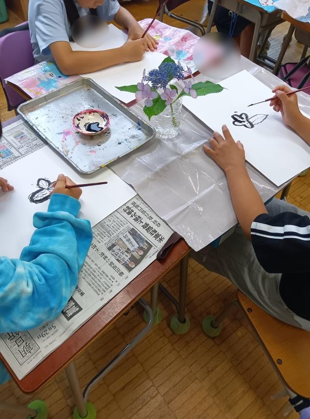 中心部に小さく細かいつくりになっている紫陽花でしたが、子どもたちは、細かいところまで表現しようと丁寧に筆を置いていっていました。