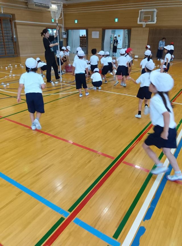 しかし、その後、赤対白による玉集め競争を見ることができました。よういドンで、それぞれのチームのかごに玉を拾って入れていきます。素早い、素早い!あっという間に全ての玉が集まりました。同点でしょうか。集合の合図で、真ん中に全員が集まり整列をします。これも素早く集まって、真っすぐ並んでいました。