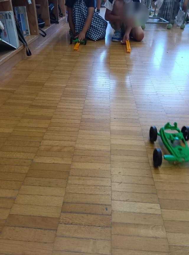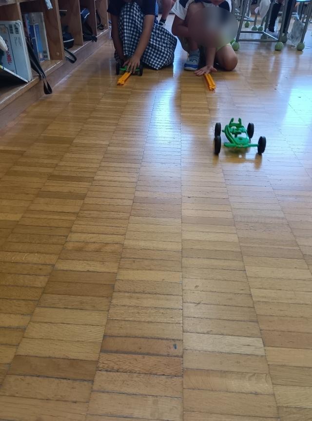 この日は、ゴムの力で車を走らせていました。ゴムの付いた発射(車?:以下、平仮名表記)台にゴムをひっかけた車を乗せ、引っ張って力をためます。手を離すと車がびゅんと跳び出す仕組みです。この日は、実験に向けての練習ということで、前に向かって発しゃ台から車を放つ練習をしていました。今後実験では、発しゃ台を固定し、ゴムを引く長さによって、車の進みがどう変わるかなどを実験します。実験を予想するときには、生活経験が基になると思います。より遠くへ行かせるためにどうすればよいかなど、学んだことをベースに色々と発展的な部分も考えらえるとおもしろいです。その時には、今回得られた実験の結果も予想の根拠になります。知識や経験が増えていくということが、次の学習につながっていきます。