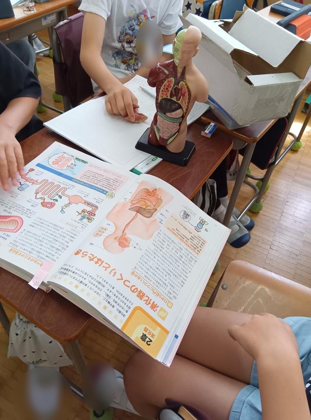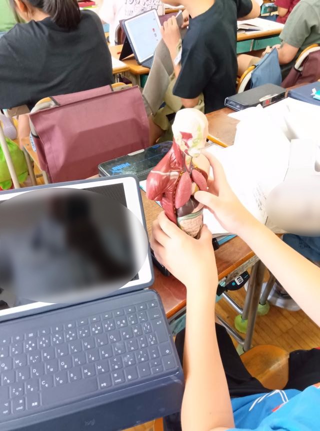 本やインターネット、人体模型を使って調べています。人体模型は、昔は大きなものが主流でしたが、最近は小さくかつ精密なものも増えてきたので、個々に扱えるタイプのものが多くなってきました。昔はおもちゃみたいな簡単なものしかありませんでしたが、私物で班の数分用意したりしたのを思い出しました。よく考えると変な私物をたくさん持っていましたね・・・。
