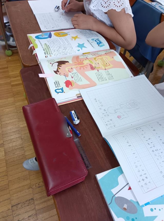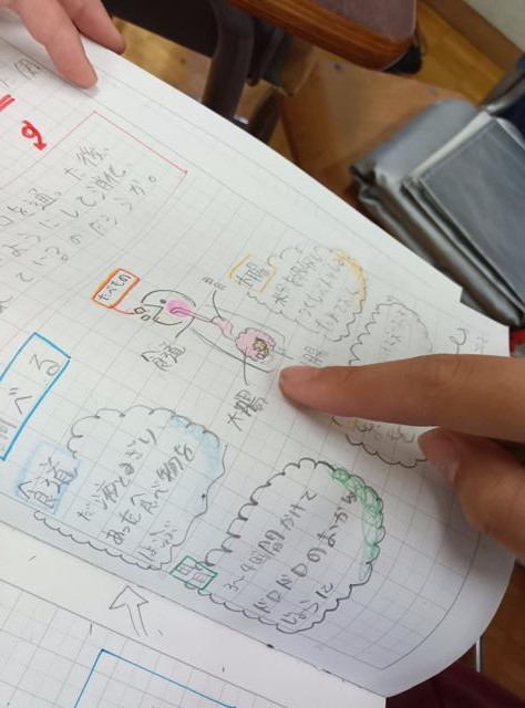 理科で動物、そして植物の「からだ」のつくりや仕組みについて学習している6年生、先日「だ液のはたらき」を実験して調べている様子をお伝えしましたが、この日はそれに加えて、消化に関する人体のはたらきについて調べていました。