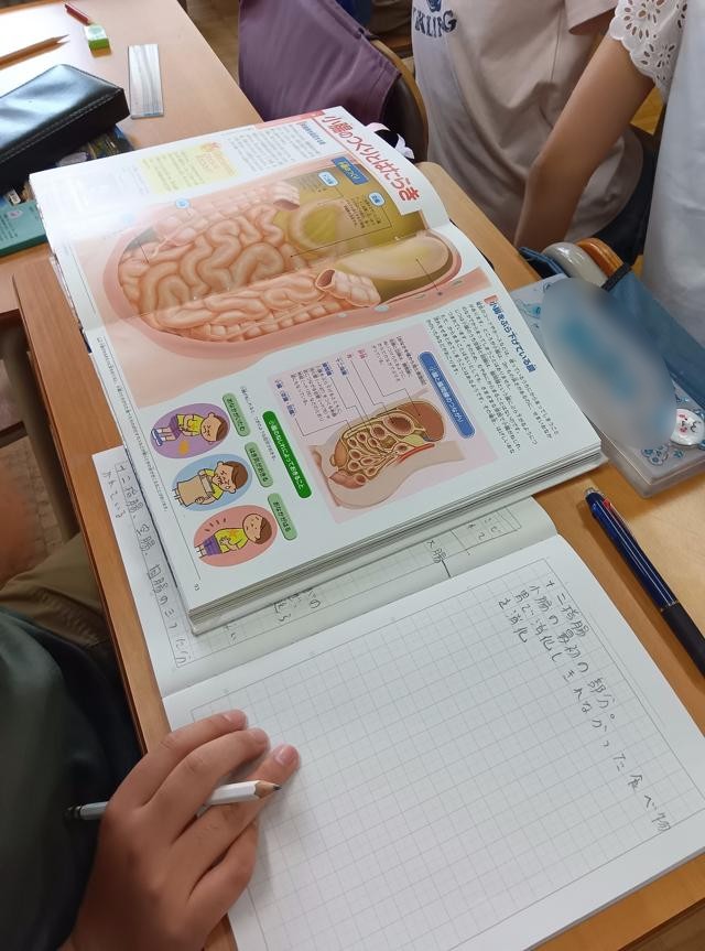 消化については、なかなか実物や実物を再現した実験は難しいので、調べて知ることが多いです。知識として知っているということになりますが、せっかくそれぞれ「人体」を持っていますし、知識を知った、で終わらせずにぜひ自分の体に当てはめて考えてもらえるといいと思います。実感を伴った理解は強いです。実験まではしなくてもいいと思いますが、ぜひ「実感」はしてほしいと思います。