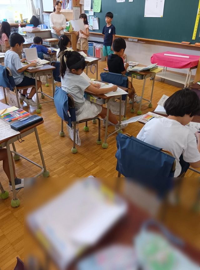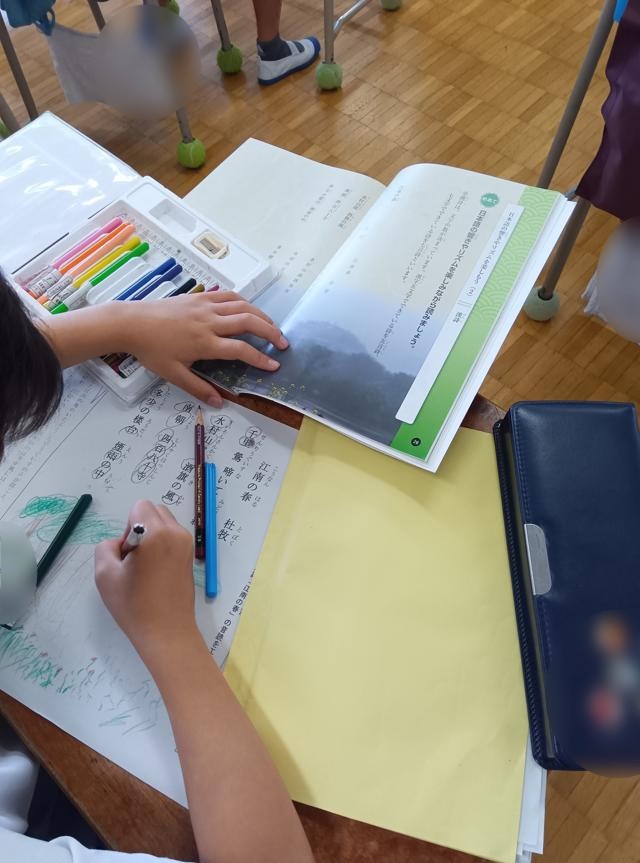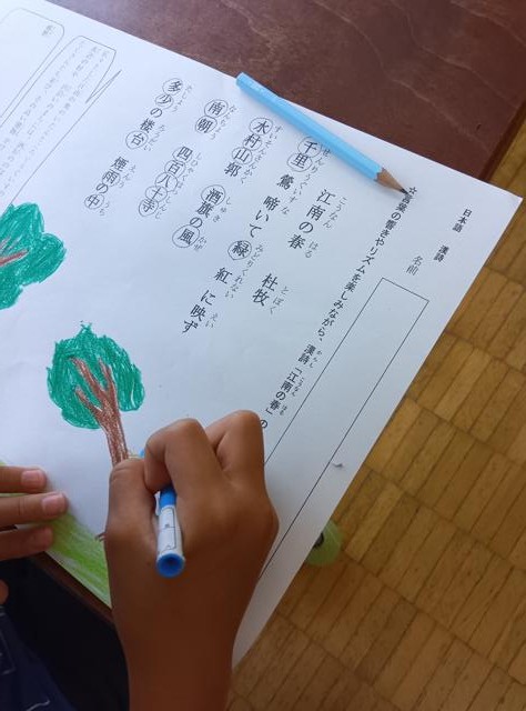 という響き、まだ体に染みついていらっしゃる方も多いと思います。視覚・聴覚・触覚すべての感覚を動員して春景色を詠んだ杜牧の代表的な作品です。子どもたちも、その風景を想像して描いたり、繰り返し読んで、響きの良さを味わっていました。絵の中には、杜牧本人も登場しているものもありました。教科日本語では、構文がどうだとか、意味がどうとかはそこまで大事ではなく、言葉の響きの良さを味わいながら読んだり覚えたりすることが大切です。もうすぐ暗誦できる子もいるようです。しっかり覚えられたらまた聞かせてほしいと思います。