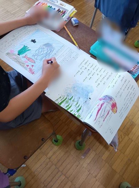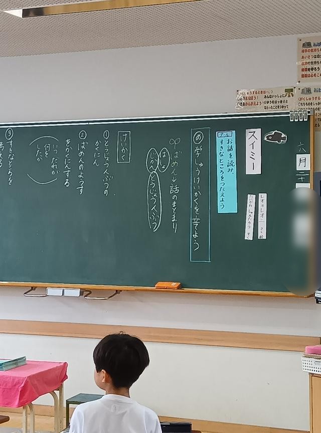2年生は、先日お話会で図書館の方に読み聞かせをしていただいた本の感想や心に残ったことを書く「一冊の本から」の学習をしていました。教科日本語の学習で、自分たちでも読み聞かせをする活動を行います。読んでいただいた経験を、自分たちの読み聞かせにも生かしていくのでしょう。その中に、「スイミー」について書いている子がいました。「スイミー」を読んでもらったのか、と隣の学級に行くと、こちらでも「スイミー」という言葉が聞こえてきます。こちらは国語で、物語文「スイミー」の学習でした。どうやら、国語で「スイミー」の学習に入る導入として、お話会の内容にも意図的に入れていただいたようです。
