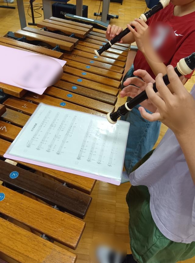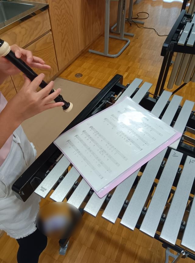 5年生の音楽では、新しい曲の練習に入っていました。「ちいさな約束」という曲で、みんなで広い音楽室のいろいろなところに分かれてリコーダーの練習をしています。様々な楽器を経験する様子もお伝えしていますが、やはり基本はリコーダーです。この曲は、リコーダーのみのようですが、合奏に取り組むときにも、まずは主旋律のリコーダーについては、全員しっかりと演奏できるように練習をします。曲は、ゆっくりとした感じですが、「ソ♯」があり、きれいに音を出すのが大変そうです。ちょっとドナドナ感があるというか、少し寂し気な感じの旋律でした。動画等出ているので、聞いてみてください。「ドナドナ感」伝わるかもしれません。