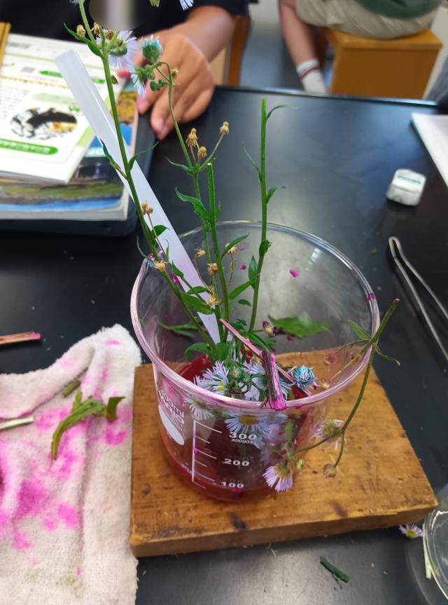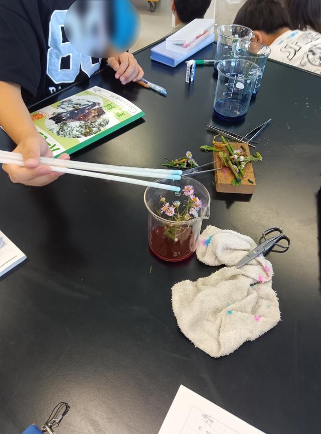 理科で、人間(動物)の体の仕組みについて学習している6年生、植物のからだの仕組みについても一緒に学習を進めています。その実験の一環で、植物のからだの中をどのようにして水が通るかを実験で調べていたのです。色水を根から吸わせて水が通ったところを確認する実験ですが、こんなに鮮やかに色が出るのです。花びらにまで色が、つまり根から吸った水がそこまで行き渡っているということ、しっかり確認できました。